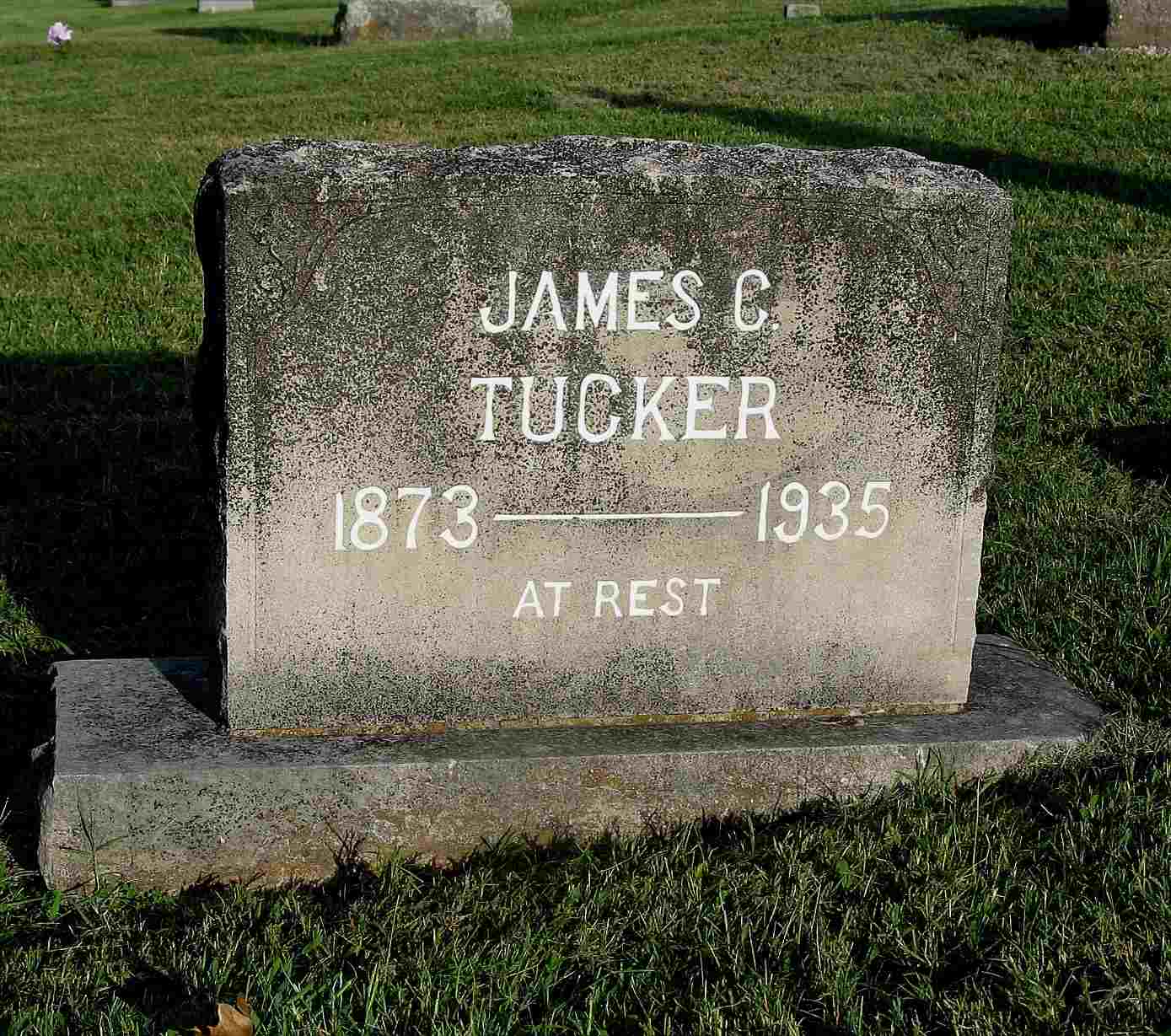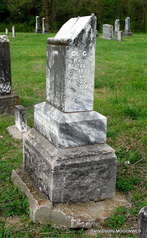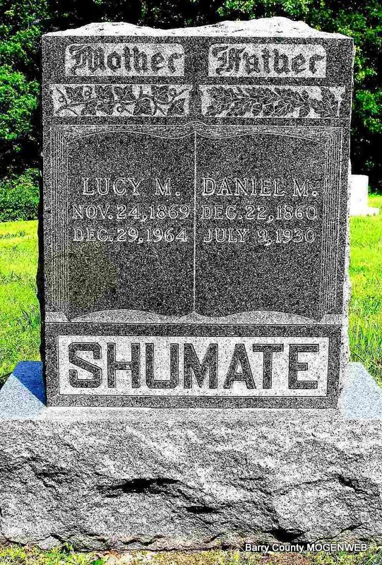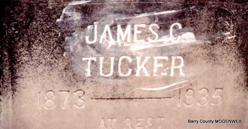 | TUCKER, James C. | 1873 | 1935 | Inscription: "At Rest" - Research Note: He was a son of Richard and Martha (Lewis) Tucker. James C. Tucker, age 19, married Emma Salyer, age 23, on Nov. 17, 1892. Richard Tucker, father of James, gave consent. Their children were Glen, Madeleine Bee, Blanch, Rufus, Ralph B. and an Infant b. 1901. James C. Tucker, age 42, second married Elizabeth Hardwick, age 19, on Feb. 8, 1916 in Carroll Co., AR. They had a son Richard. - July 17, 1913, Thursday, Cassville Republican - J.C. Tucker of Golden was in Cassville Sunday night. He went to Joplin on business, Monday. - Cassville Republican, Barry Co., MO, Thursday, Jan. 25, 1900 - Golden News: Fox hunting is the order but very few are caught. W. A. Phillips thinks his hounds would give a fox a good chase if the rabbits would quit bobbing up in front of them. J. C. Tucker has considerable invested in hounds but said if anybody has a hound that can outrun a red fox he can find a sale for it at Golden. - August 25, 1910, Thursday, Cassville Republican - Albert Tucker of Eureka Springs accompanied his cousin J. C. Tucker of Golden and attended the reunion. - September 15, 1910, Thursday, Cassville Republican - J. C. Tucker of Golden was here Wednesday after a corn cutter. He said the people of that vicinity were very busy cutting corn and getting ready for sowing wheat. - July 27, 1911, Thursday, Cassville Republican - Golden News: J. C. Tucker is very busy at this writing notifying hands and working on the roads. - January 23, 1913, Thursday, Cassville Republican - Viola News: J.C. Tucker is agent for the Indiana Silo Co. - March 27, 1913, Thursday, Cassville Republican - J. C. Tucker of Golden, while in Cassville the first of last week, stated that he had made an order for the first car load of the Indiana silo which he is an agent for. He believed that there will be a number of silos built this year in that section of the county. - December 17, 1914, Thursday, Cassville Republican - J. C. Tucker will hold a public sale Friday, December 18, at his farm on White River at the old Golden Ferry. He offers for sale 2 good mares, 4 good milk cows, 6 calves, 8 head of fine hogs, 800 bushels of corn and hay and other food, farm implements and household goods. Lunch will be served on the ground. Al Hudson of Fairview will auctioneer be the sale. - December 21, 1916, Thursday, Cassville Republican - J. C. Tucker of Golden was in Cassville Saturday. He stated that he did not think that it got to zero Thursday night at his locality. He says that his mother, Mrs. Richard Tucker, has not been in very good health for some time and is now confined to the house most of the time. - Another Photo | Online Newspapers MO Marriage Records AR Marriage Index Phyllis Long Headstone Note Photo Darla Ball Marbut Photo Jack Fly |
