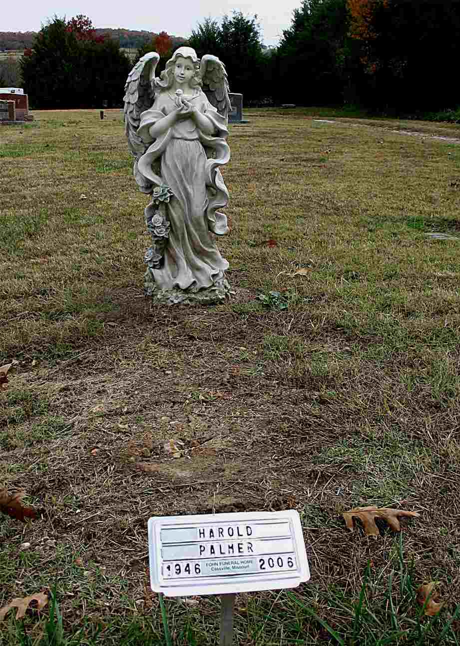 Research Note: Temporary Marker - Research Note: Harold Lee Palmer, Jr., 59, of Golden, passed away Friday, Jan. 27, 2006, in Washington Regional Medical Center, Fayetteville, AR. He was born May 28, 1946, in Kansas City, and was a son of Harold Lee, Sr. and Lelabelle (Lockard) Palmer. On May 28, 1998, he was united in marriage to Linda Holder. He was preceded in death by his parents and one sister. From Feb. 10, 1969, until April 17, 1970, he served in Vietnam with the United States Navy. He was also a member of Sons of Confederate Veterans. - Harold Lee Palmer, Jr., age 21, first married Lucinda Jean Narez, age 21, on Mar. 23, 1968 in Kansas City, Jackson Co., MO. | MO Marriage Records Phyllis Long Photo Jack Fly Cassville Democrat Feb. 2, 2006 Donna Cooper |