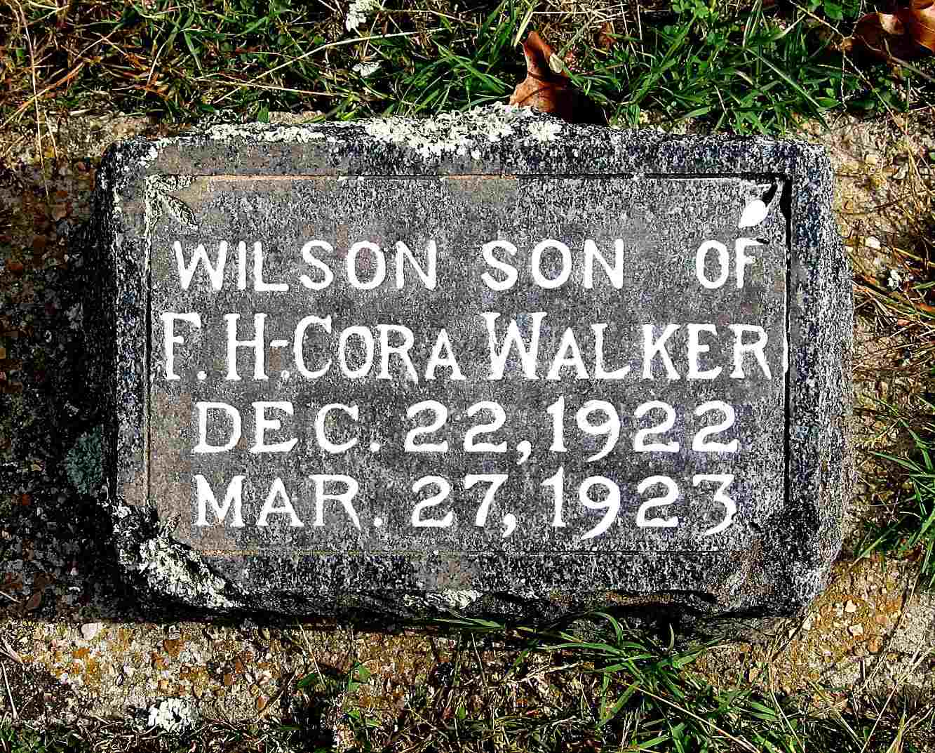 | WALKER, Wilson | Dec. 22, 1922 | Mar. 27, 1923 | Inscription: "Son of F. H. and Cora Walker" | Headstone Darla Ball Marbut Photo Jack Fly |