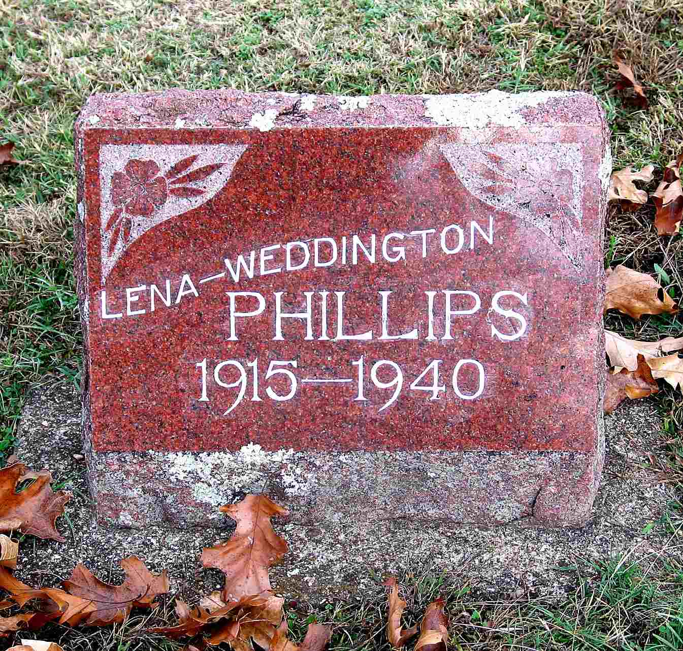 Research Note: Daughter of Emma Roberts born Golden, Barry Co., MO and Tilden H. Weddington born Floyd Co., KY. Killed in an auto accident on Hwy. 86. Her husband was Eugene Phillips. - Golden Woman Dies in Accident - Mrs. Lena Phillips, 23 of Golden, MO, was killed Sunday and four persons were injured in an automobile accident, which occurred about fifteen miles southeast of Cassville, MO. The automobile in which they were riding overturned and plunged forty feet down a hill. The injured were Mrs. Phillips' daughter, Beverly, age 4, Mrs. Tilden Weddington, J. P. Weddington and Gene Bowman. Mrs. Weddington is Mrs. Phillip's mother, and J. P. Weddington, her brother. | Family Records Kathryn Johnson Death Certificate News Item Census Phyllis Long Photo Jack Fly |