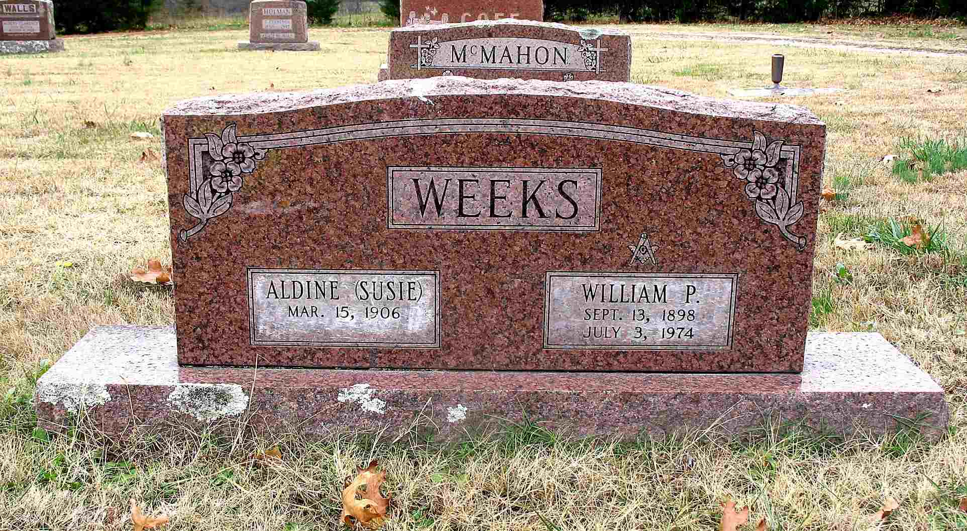 July 3, 1974 | SSW: Aldine "Susie"- Research Note: William Percy Weeks was a son of Austin Allen and Thirza Malinda (Herndon) Weeks. His first wife was Alice Margaret Cundiff. Second wife Rose Aldine (Mack) Moore. | Headstone Darla Ball Marbut Note Donna Cooper Census Phyllis Long Photo Jack Fly |