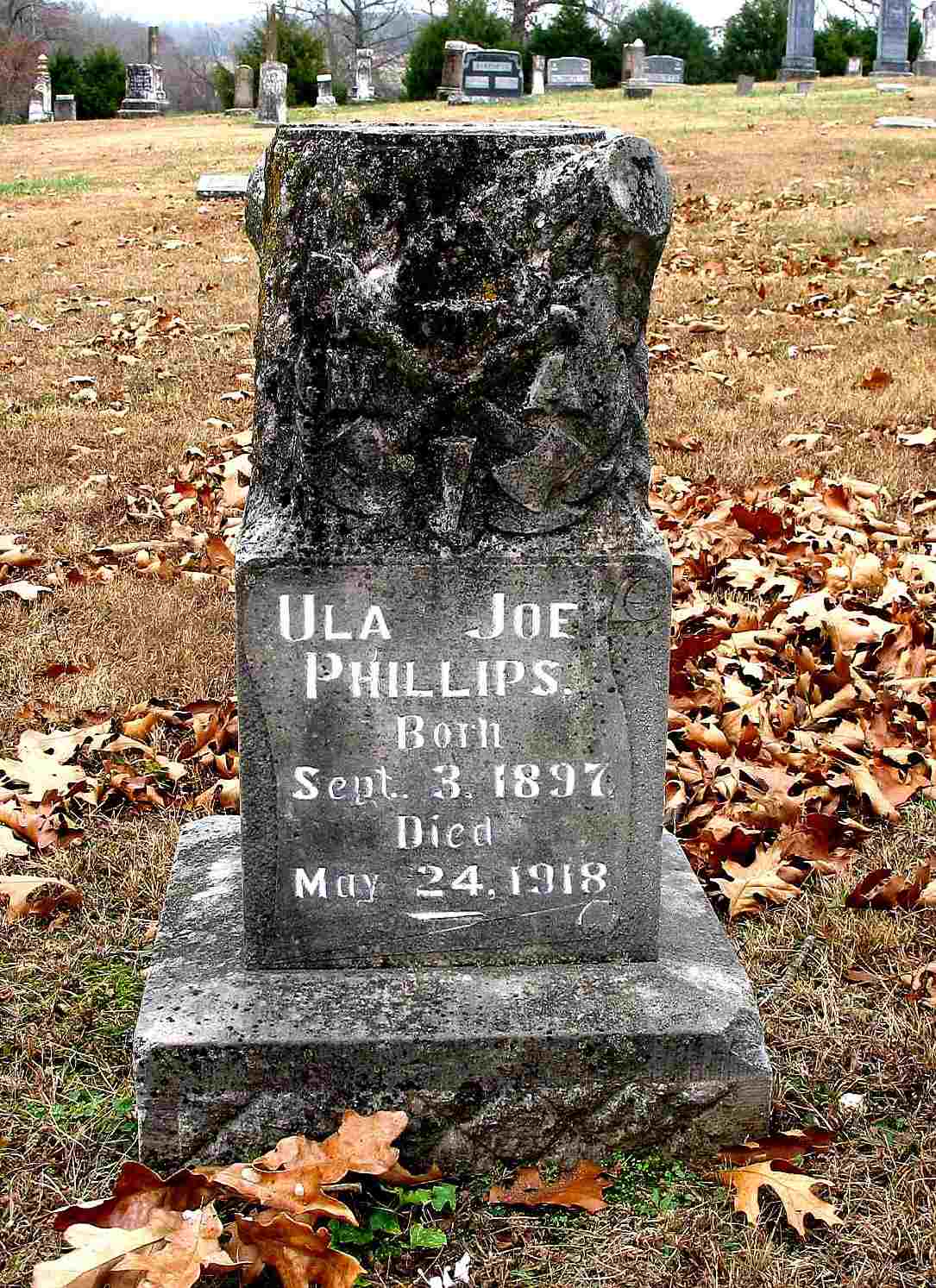 Research Note: Death certificate indexed as Ola Joe Phillips. Son of William Andrew Phillips and Sarah S. Whittenburg. Cause of death was complications following operation for appendicitis. E. G. Phillips of Miami, OK was the informant. | Death Certificate Phyllis Long Headstone Darla Ball Marbut Photo Jack Fly |