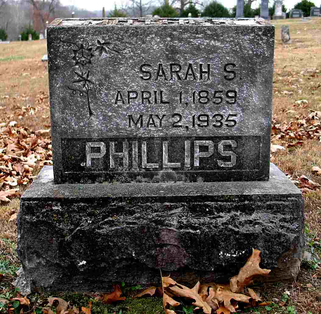Research Note: Her death certificate names Isaac Whittenburg as her father and the name of her mother was unknown to the informant but TN was given as her birth place. She was widowed. The cause of death was given as mitral insufficiency. Gene Phillips was the informant. Her mother was Mary Elizabeth Wright. Sarah S. Whittenburg married William A. Phillips on Oct. 9, 1877 in Greene Co., MO. | Census MO Marriage Records Phyllis Long Headstone Darla Ball Marbut Death Certificate Donna Cooper Photo Jack Fly |