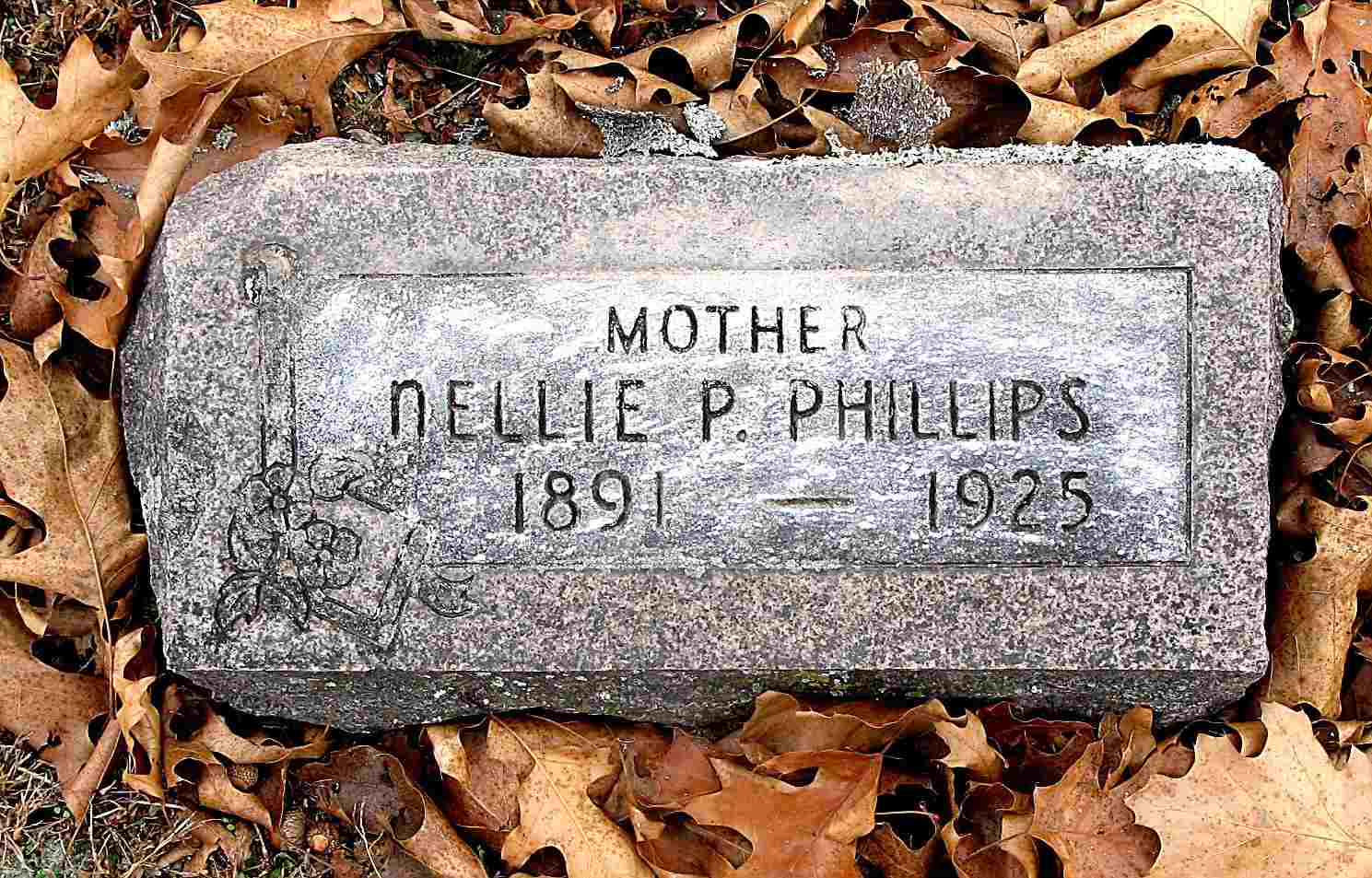 Inscription: "Mother" - Research Note: Her death certificate states that her parents were George and Laura (Smith) Westenhaver. Nellie Westenhaver married George E. Phillips on Apr. 18, 1909 in Barry Co., MO. | Headstone Darla Ball Marbut MO Marriage Records Phyllis Long Death Certificate Donna Cooper Photo Jack Fly |