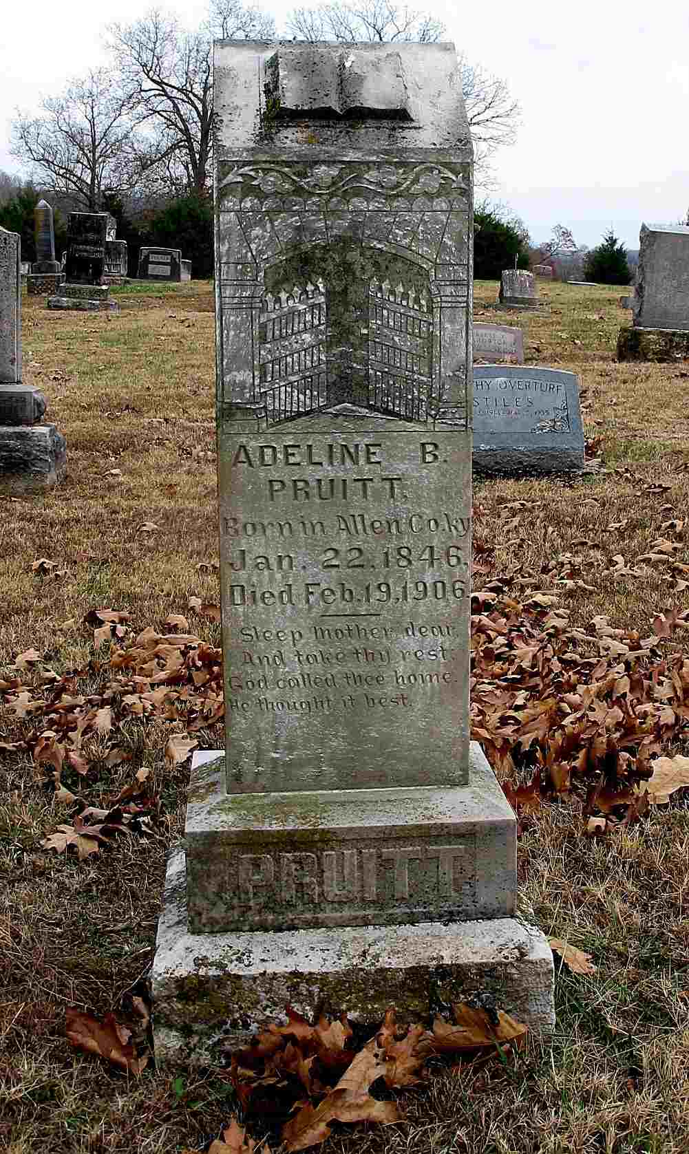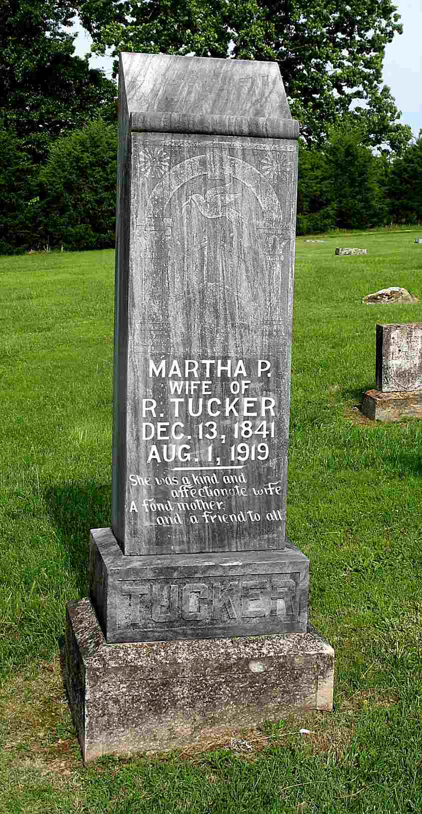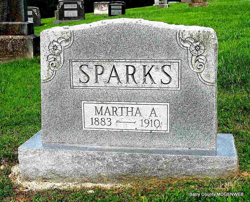 Research Note: Daughter of William Lewis and Eliza (Sullivan) Lewis. Wife of Judge Richard Tucker. - Obit: MRS. RICHARD TUCKER DEAD - A splendid life has closed with an excellent record on the right side of the ledger, that was beautifully balanced in life's blood, assuring her of sweet rest in the mansions of eternal glory in the Holy City, where her loved ones can fain admission by living the same beautiful life that was lived by their mother during life. The opportunity is before them without money or price. Mrs. Martha P. Lewis was born in Texas in December 1844 and came to Barry county with her parents when a young girl and grew to womanhood in this county and then married the late Judge Richard Tucker, a well known and highly esteemed citizen of Barry county. To this union two sons and one daughter are living to mourn the passing of a good mother who are: Wm. and Jas. Tucker of Golden and Mrs. Dove Lee of Willeteka, Okla., who were at her death at her home near Golden, Friday, August 1, 1919. She was the sister of Clint and Wm. Lewis of Clifty, Ark., Mrs. Jas Tucker of Urbanette, Ark. and Mrs. Helen Trammell of Lincoln Ark. She was a woman of high character, imbued with the spirit of right and always practiced it. As evidence of her goodness of heart when the awful tornado visited Golden and vicinity, killed several neighbors, wounded several and destroyed their homes she gave each family $10 in cash. She had been a member of the Christian church since girlhood and was a consistent member. Rev. Mack Haggerty conducted services at Viney cemetery on the 2nd, where the remains were laid to rest beside her husband. Her loved ones should follow in her footsteps because she lived an exemplary life that will be worth their while to follow. - Her Obit has the birth year as 1844, stone reads 1841. | Online Obit Headstone Darla Ball Marbut Photo Jack Fly |