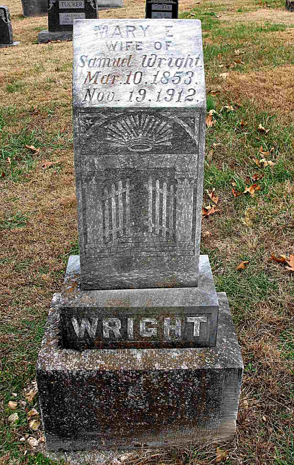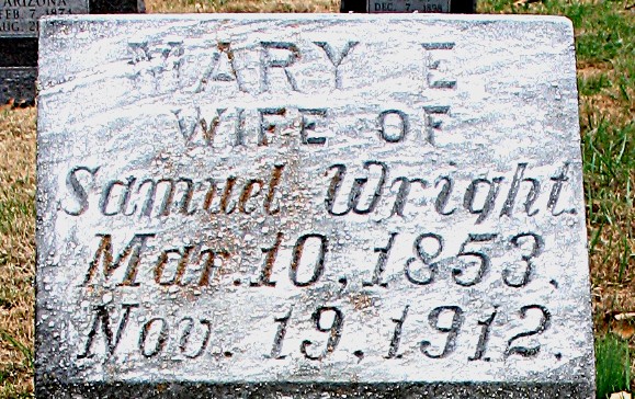 Inscription: "Wife of Samuel Wright" - Research Note: Her death certificate reads that she was a daughter of John Myers and that she was buried in Spring Grove Cemetery. She died from the effects of TB and Samuel Wright gave the information. Mary E. Myers, age 19, married Samuel Wright, age 23, on Feb. 27, 1873 in Douglas Co., KS. - Another Photo | Headstone Darla Ball Marbut Death Certificate Donna Cooper KS Marriage Index Phyllis Long Photo Jack Fly |