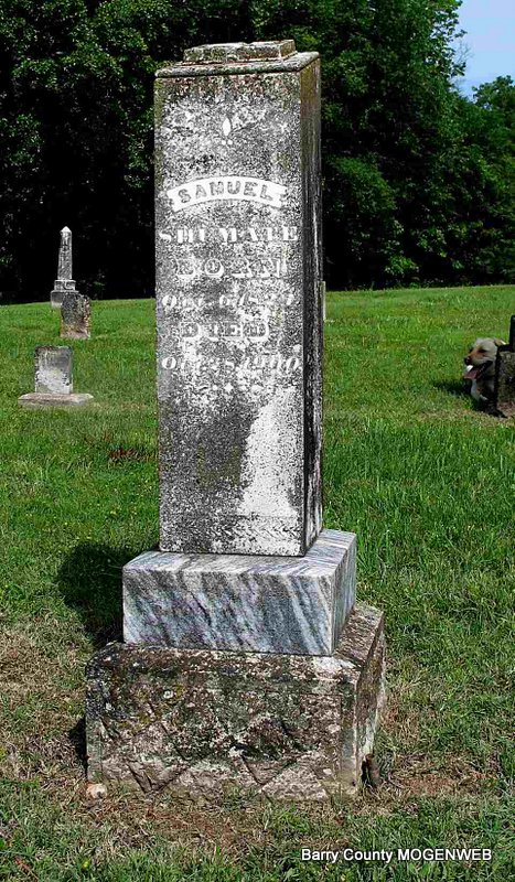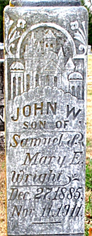 SSW: Ella Mason - Inscription: "Son of Samuel and Mary E. Wright" - Research Note: Ella (Wright) Mason was his sister. His death certificate reads that he was a son of Samuel and Mary E. (Myers) Wright and that he died from the effects of TB and that he was buried in Spring Grove Cemetery. - Cassville Republican, November 16, 1911 - John Wright who has been sick for some time, died Saturday morning and was buried Sunday evening at Viney cemetery. The funeral was held at the church house at Golden conducted by Rev. W. C. Gilbert. - Another Photo | Headstone Darla Ball Marbut Death Certificate Donna Cooper Online Obit Phyllis Long Photo Jack Fly |