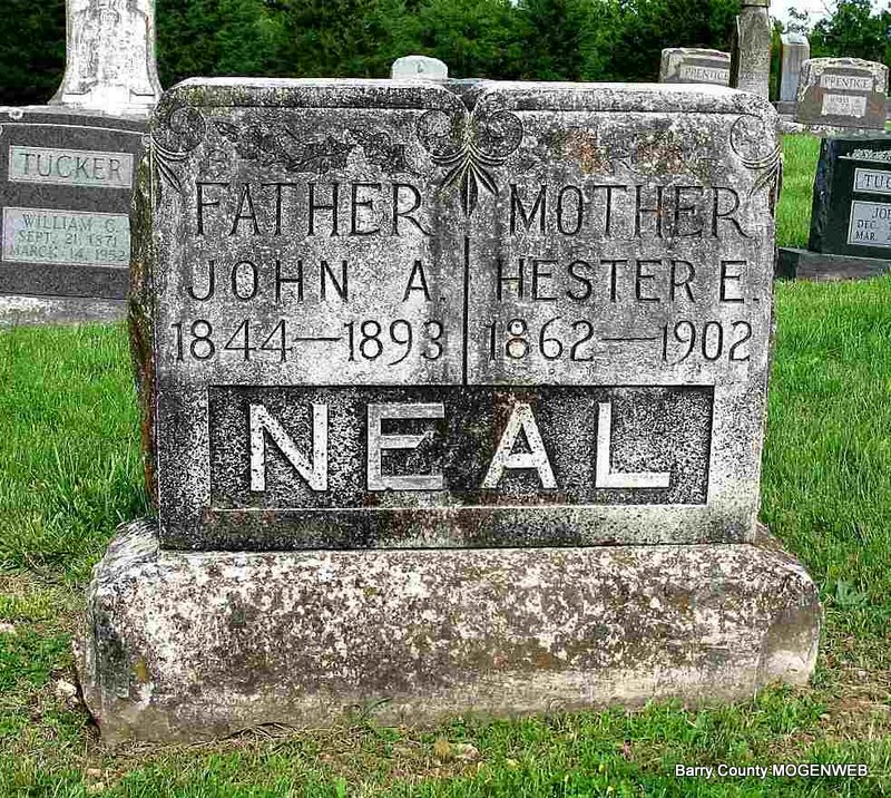 | NEAL, John Aaron | 1844 | 1893 | SSW: Hester E. - Inscription: "Father" - Research Note: Findagrave has his birth date as July 9, 1845 and died Feb. 2, 1903. John A. Neal is listed with his wife and children in White River, Barry County, MO in the 1900 census. Perhaps the headstone was added later by family members who may have had incorrect information on his death date. Son of Aaron Neal and Elizabeth (Clampet) (Neal) Harrison. | IL Marriage Records Census Phyllis Long Headstone Darla Ball Marbut Photo Jack Fly |