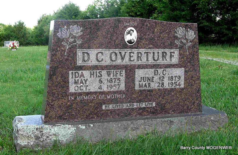 SSW: Ida - Inscription: "Daddy - He Lived and Let Live" - Research Note: Calvin D. Overturf, age 18, married Ida Wood, age 21, on July 22, 1897 in Pottawatomie Co., OK. Son of John D. Overturf and Sarah E. Beaty. | OK Marriage Records Census Phyllis Long Headstone Darla Ball Marbut Photo Jack Fly |