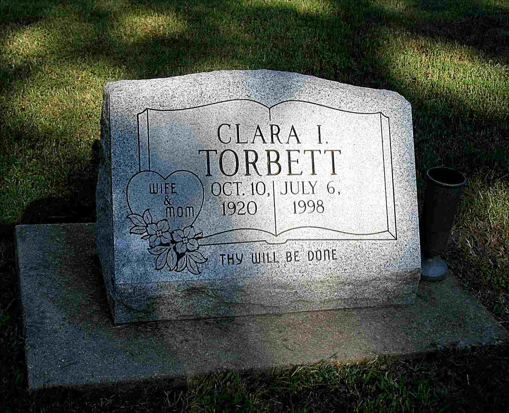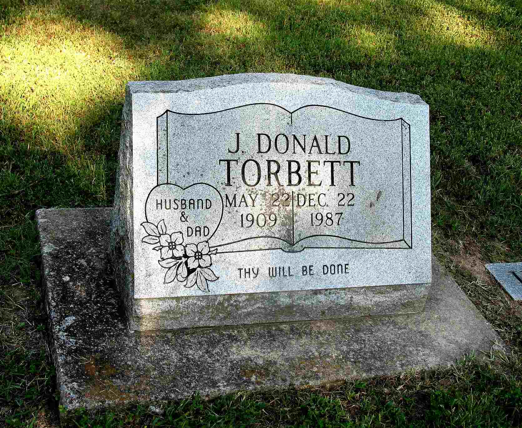 Inscription: "Husband and Dad - Thy Will Be Done" - Research Note: Son of Edwin Clarence Torbett and Bessie G. Jackson. Donald Torbett, age 25, first married Wilma Odette, age 19, on Aug. 27, 1934 in Garland Co., AR. He second married Clara Irene Miller in 1963. | Census AR Marriage Index Phyllis Long Headstone Darla Ball Marbut Photo Jack Fly |