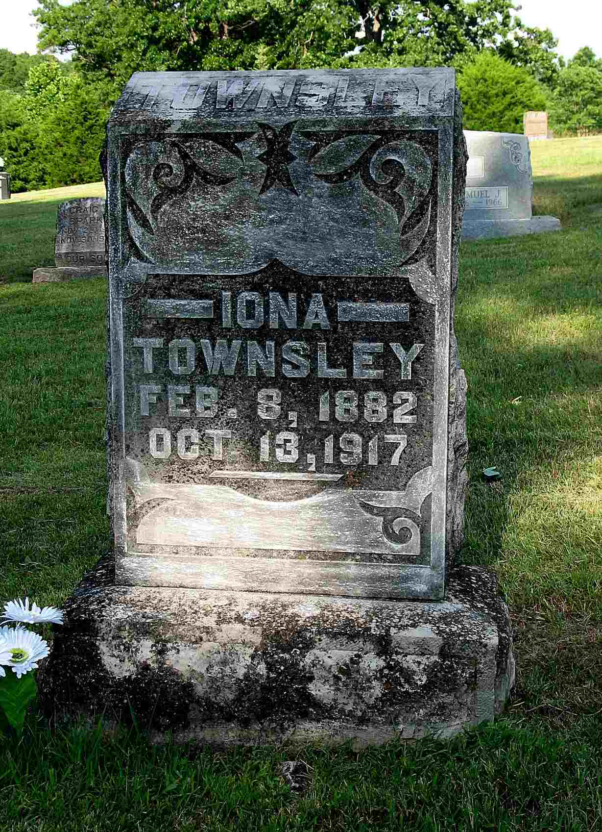 Research Note: She was married and the daughter of Albert Frank Hardwick born IN and Amanda Dixon/Dickson born Mayesville, KY, both buried in Viney Creek Cemetery. Consumption was the cause of death. Her mother was the informant. Former residence was near Ft. Smith, AR. Iona Hardwick, age 23, married Edward Townsley, age 34, on May 10, 1905 in Crawford Co., AR. | Headstone Darla Ball Marbut Death Certificate AR Marriage Index Phyllis Long Photo Jack Fly |