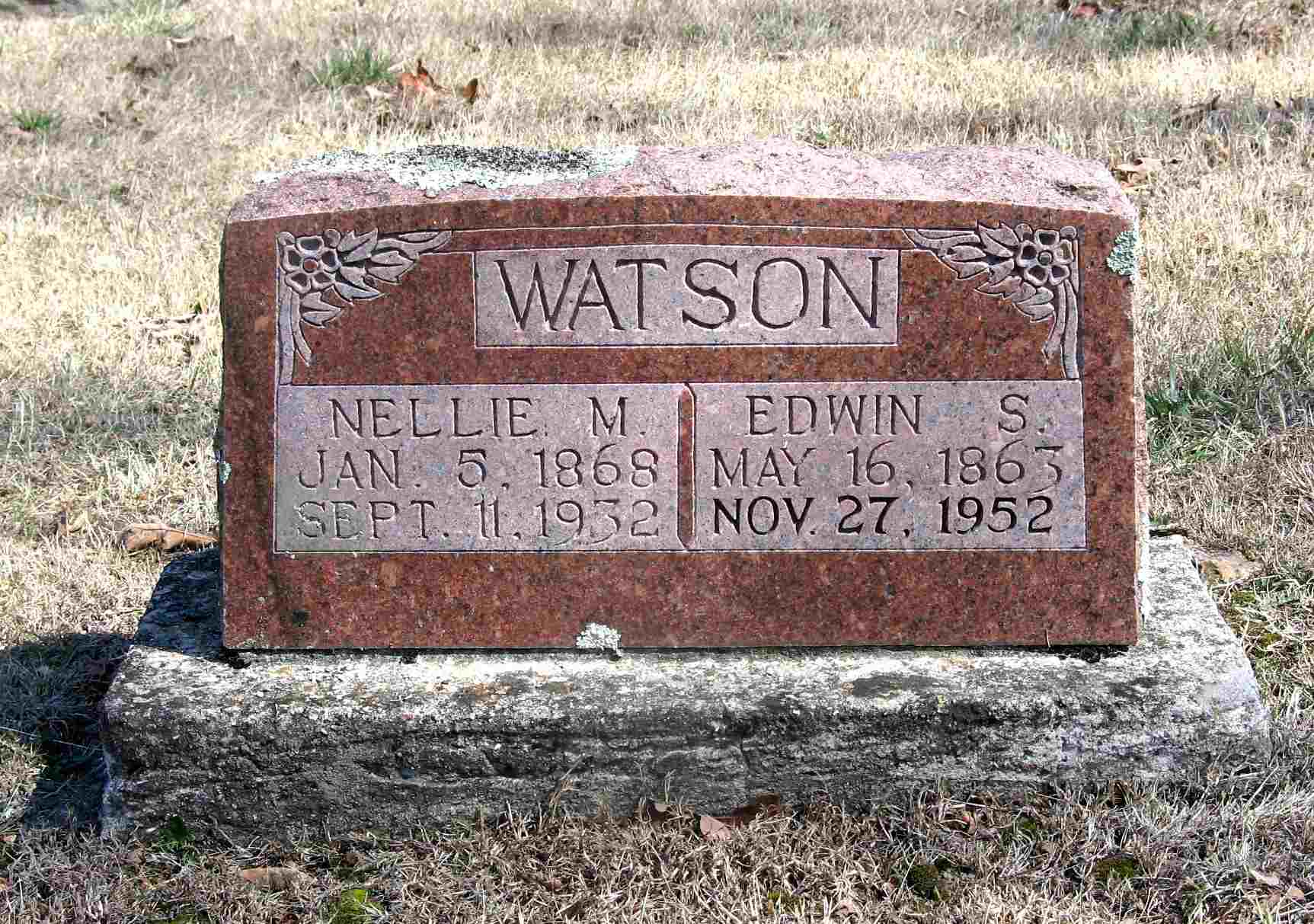 SSW: Edwin Seamore - Research Note: Her death certificate reads that her father was William Coberly and her mother Adeline Lyals, born in IL, and her husband was listed as E. S. Watson. The cause of death was given as chronic nephritis and paralysis. The date of her death is given as Sept. 10, 1932, and not the 11th as the stone reads. E. S. Watson, Shell Knob, MO, was the informant. Edwin S. Watson, age 23, married Nellie M. Coberly, age 17, on Jan. 6, 1886 in Carroll Co., AR. | Headstone Darla Ball Marbut Death Certificate Donna Cooper AR Marriage Index Phyllis Long Photo Jack Fly |