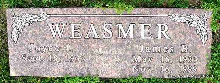 Research Note: Our loving mom, grandma, great-grandma, aunt and sister-in-law peacefully returned to our Heavenly Father the evening of November 27, 2007 with her children by her side. She was born Sept. 16, 1933 in Oxford Junction, Iowa and married Jim Weasmer in 1953. Together they raised a family of four children in Maquoketa, Iowa. They moved to Missouri in 1982 and found a lake home where they shared their great passion of fishing together. Joyce was devastated upon Jim's passing in 1999, but filled the void with volunteer work for the Humane Society. She moved to Utah in 2005 to be near family. Her husband, sisters and brothers preceded her in death. Her wishes were that the ashes from her remains be placed next to her husband in Missouri, with graveside services only, which will be held at a later date. - This brief note was in the Cassville Democrat - Joyce Weasmer, former resident of Cassville and Eagle Rock, passed away Nov. 27, 2007. | Russon Funeral Home Phyllis Long Photo Jack Fly Cassville Democrat Donna Cooper |
