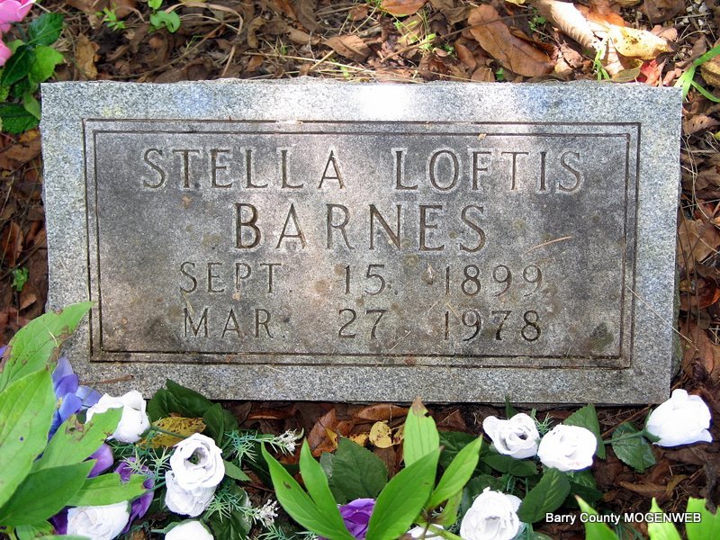 | BARNES, Stella (SCHREINER) (LOFTIS) | Sept. 15, 1899 | Mar. 27, 1978 | Research Note: Daughter of Nathaniel Franklin Schreiner and Ida Belle Willyard, both buried in Viola Cemetery. She first married James E. Loftis, listed on this page. Stella Loftis, age 38, second married Elbert Jasper Barnes, age 47, on Apr. 6, 1938 in Carroll Co., AR. | Father's Obit Census Phyllis Long Headstone Penny Cooper Bailey Photo Jack Fly |