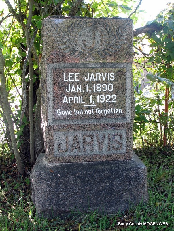 Inscription: "Gone but not forgotten" - Research Note: Son of Caleb Marion Jarvis and Sarah Margaret Truman. Lee Jarvis, age 27, married Anna Bea Bowman, age 18, on June 4, 1917 in Carroll Co., AR. TB was the cause of death contracted in the US ARMY. | Census AZ Death Certificate AR Marriage Index Phyllis Long Headstone Penny Cooper Bailey Photo Jack Fly |