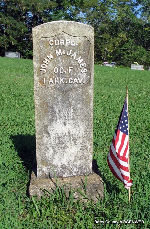 Inscription: "Corp. Co F 1 Ark. Cav." - Research Note: Son of John James and Nancy C. Right. He served in the US Civil War - Patty's Note: Additional information: Supplemental death certificate lists his date of birth as June 19, 1840. Father listed as John James born TN, and states J. M. James was born in TN. Informant was M. M. James of Sulphur, OK. Died of Acute Cystitis with kidney disorder and senility. First wife was Alwillda Pauline Edmonson. Third husband of Frances Abigail "Fannie" (Richardson) (Summers) (Standlee) James. - Cassville Democrat, Jul. 15, 1922 - Squire James, an old and respected citizen of Viola, died June 24, of infirmities of age, aged 84 years. He was a member of the Baptist Church and the remains were interred in the cemetery there. He was a veteran of the civil war. His second wife and a son survive him. - August 11, 1910, Thursday, Cassville Republican - W. A. Rose of Viola was here Monday night. He reports the injury of his father, Wm. Rose and J. M. James, Sunday, as a result of being thrown from a buggy. They were returning from church, while driving down a steep hill the harness broke and not being able to control the buggy they were both thrown from the vehicle sustaining injuries. Mr. James had a collar bone broken and otherwise bruised up. Mr. Rose was badly injured about the shoulders. Mr. James has not yet been taken home but is at the home of a Mr. Wolfenbarger near where the accident occurred. | Headstone Penny Cooper Bailey Online Civil War Soldier History Online Obit Brian Shay GGrandaughter Geradine R. Ford Death Certificate Patty McWilliams Online Newspapers Phyllis Long Photo Jack Fly |