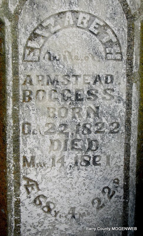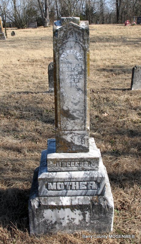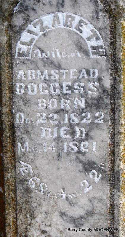 Inscription: "Wife of Armstead Boggess - Age 68 y. 4 mo. 22 D. - Mother" - Research Note: Researchers say she was the daughter of Samuel K. Parker and Elizabeth Williams. - March 26, 1891, Thursday, Cassville Republican - Died on March 13th 1891, at the home of her son, J. W. Boggess, at Viola, Missouri, Elizabeth Boggess, aged 68 years, 5 months, and 22 days, having been born, Oct. 22, 1822, in Cape Girardeau Co., MO. She obeyed the gospel about age 37 years old and has ever since lived the life of a life of an upright and conscious Christian. She was conscious up to the hour of her death and gladly welcomed the home where she should depart this life, saying it would be the happiest exchange for life. Her last words were for all to be good, and at different things during her last sickness she told those around her not to weep for her but only be prepared to insure in that world where parting would be no more. She leaves two children and two grand-children to mourn her departure, who are comforted only with the thought that the final inheritance is prompted to them who hold out faithful, and the blessing to those who die in the Lord. - Another Photo - Another Photo | Headstone Penny Cooper Bailey Online Newspapers Phyllis Long Photos Jack Fly |
