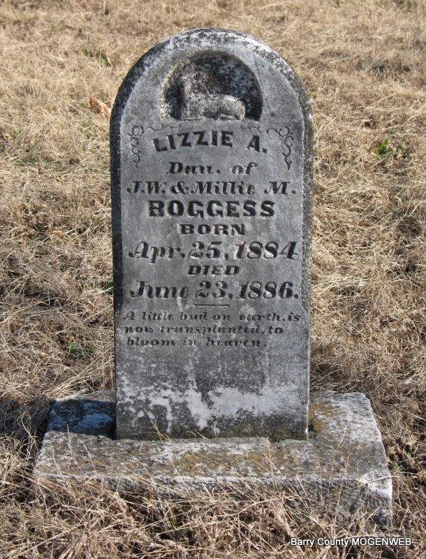 | BOGGESS, Lizzie A. | Apr. 25, 1884 | June 23, 1886 | Inscription: "Dau. of J. W. and Millie Boggess" - Research Note: Daughter of John Washington Boggess and Amelia M. "Millie" Rogers. | Note Phyllis Long Headstone Penny Cooper Bailey Photo Jack Fly |
