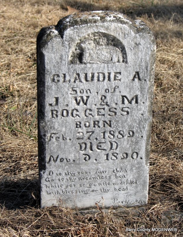 | BOGGESS, Claudie A. | Feb. 27, 1889 | Nov. 6, 1890 | Inscription: "Son of J. W. and M. Boggess" - Research Note: Son of John Washington Boggess and Amelia M. "Millie" Rogers. | Note Phyllis Long Headstone Penny Cooper Bailey Photo Jack Fly |
