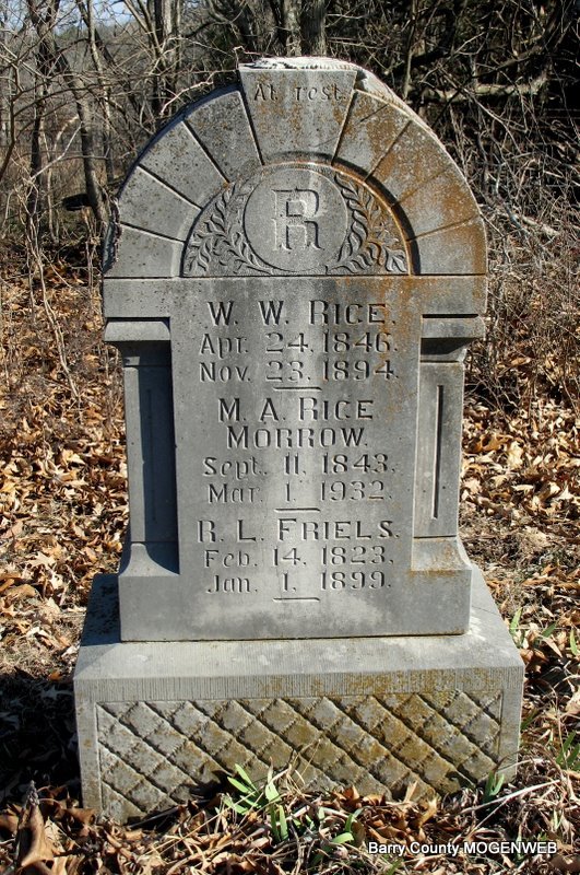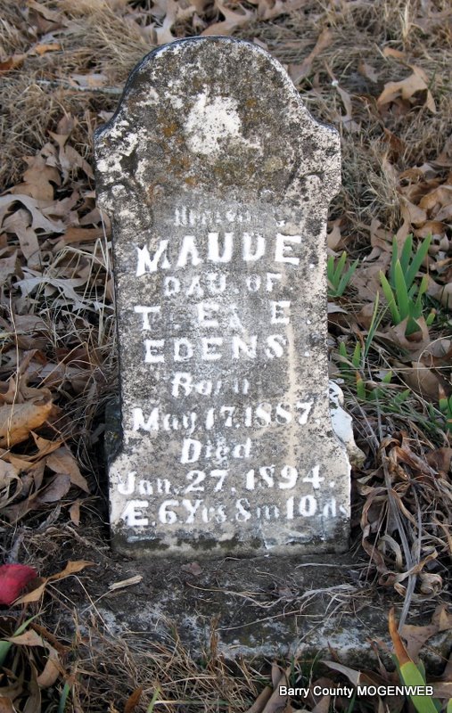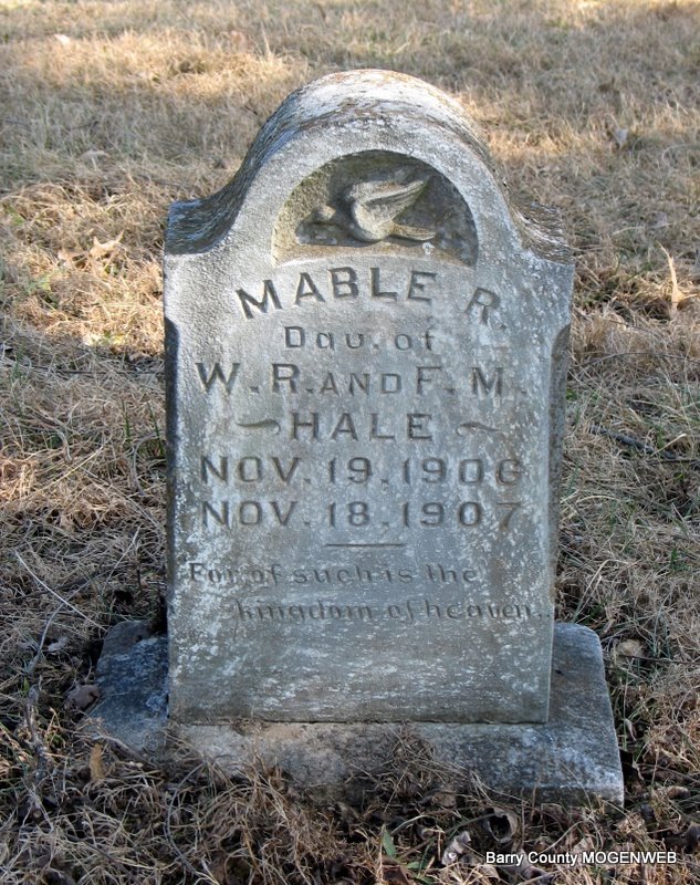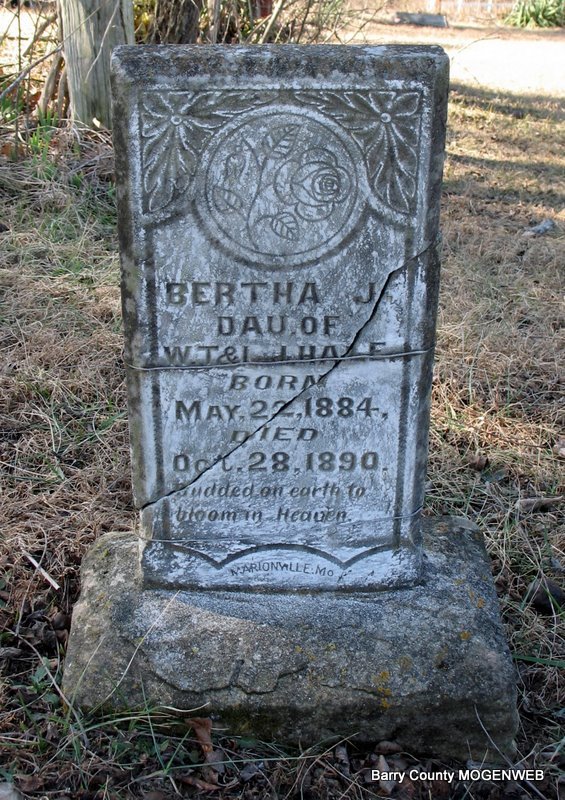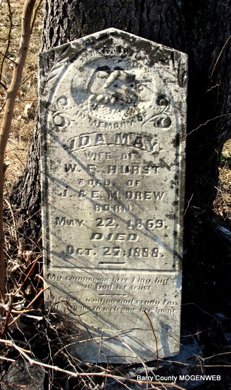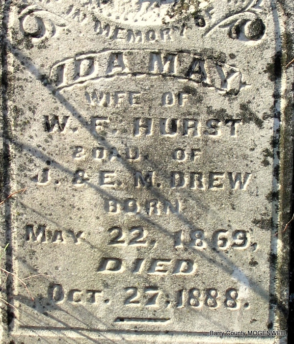 | HURST, Ida May (DREW) | May 22, 1869 | Oct. 27, 1888 | Inscription: "Wife of W. F. Hurst - Dau. of J. and E. Drew" - Research Note: Daughter of Jesse Drew and Elva Burrow. Ida M. Drew married William F. Hurst on Jan. 9, 1888 in Viola, Barry Co., MO. - Another Photo | Census MO Marriage Records Phyllis Long Photos Jack Fly |