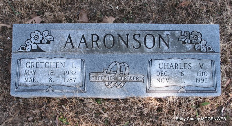 SSW: Gretchen L. - Research Note: Army Veteran. Enlisted on Jan. 26, 1942 and released on Oct. 25, 1945. Son of Charles Emil Aaronson and Maude L. Chapman. There are 2 different marriage dates to Gretchen Lowe. Charles Aaronson, age 50, married Gretchen Lowe, age 29, on Aug. 5, 1961 in Lancaster, Schuyler Co., MO. Charles Aaronson, age 52, married Gretchen Lowe, age 31, on Nov. 23, 1963 in Lancaster, Schuyler Co., MO. | Veteran Burials MO Marriage Records Census Phyllis Long Headstone Penny Cooper Bailey Photo Jack Fly |