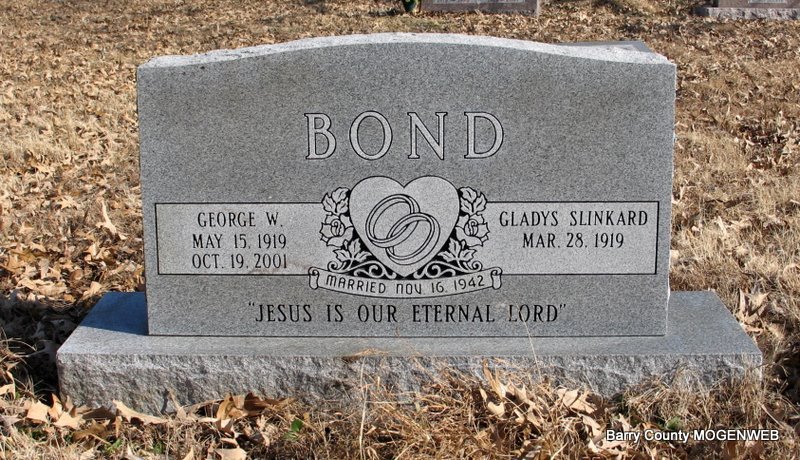 SSW: George W. - Inscription: "Married Nov. 16, 1942" - Research Note: She was the daughter of David Guy and Ollie Lillian (McClain) Slinkard. On November 16, 1942, in Washington, D.C., she was united in marriage to George W. Bond, who preceded her in death on October 19, 2001. Also preceding her in death were her parents; one son, Gerald William Bond; three brothers, Weldon Slinkard, Melvin Slinkard and Norman Slinkard and one sister, Bette Crites. Gladys graduated from high school in Delta, Missouri and attended Business College at Cape Girardeau, Missouri. She then moved to Washington, D.C., where she worked twenty-two years for the Civil Service as a clerk. Upon her husband's retirement from the Air Force, they moved to St. Louis, Missouri, remaining there until 1974, when they moved to Shell Knob to make their home. | Headstone Penny Cooper Bailey Fohn Funeral Home Phyllis Long Photo Jack Fly |