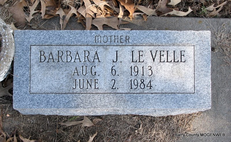 June 2, 1984 | Inscription: "Mother" - Research Note: Daughter of Silas Fred Steele and Emma Margaret Siebenthaler. Barbara Steele, age 26, daughter of S. F. Steele, married George Ross LeVelle, age 26, son of C. W. Levelle, on Dec. 8, 1939 in Kay Co., OK. | Census OK Marriage Index Phyllis Long Headstone Penny Cooper Bailey Photo Jack Fly |