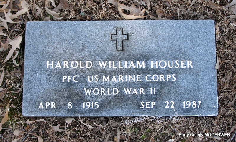 Inscription: "PFC US MARINE CORPS - WORLD WAR II" - Research Note: Son of Joseph Houser and Mary Christina Yeoham. - Springfield, News-Leader, Sept. 27, 1987 - Shell Knob: Memorial graveside services will be at 2 p.m. Tuesday in Viola Cemetery, south of Shell Knob. The body has been cremated under the direction of Axley's-Shell Knob Mortuary. Mr. Houser, a retired electrician, died at 9 p.m. Tuesday in his home after an apparent heart attack. | Census News-Leader Phyllis Long Headstone Penny Cooper Bailey Photo Jack Fly |
