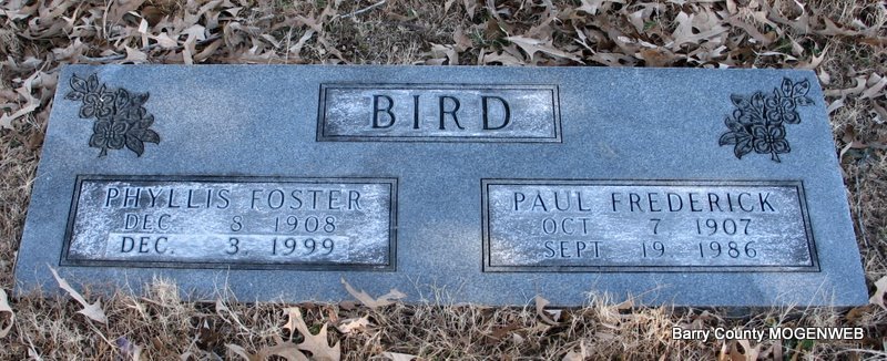SSW: Paul Frederick - Research Note: She was a daughter of Charles Oliver and Margaret (Foster) Shultice. She was the wife of Paul Frederick Bird. Phyllis F. Bird, age 91, of Shell Knob, died at December 3, 1999 at Primrose Health Care Center in Springfield following a long illness. She was born December 8, 1908, in Niles, Kansas. She married Paul F. Bird on October 23, 1931, in Topeka, Kansas, and he preceded her in death. She was preceded in death by one sister, Beth Peck. | Headstone Penny Cooper Bailey Monett Times Dec. 8, 1999 Mary Homesley Photo Jack Fly |