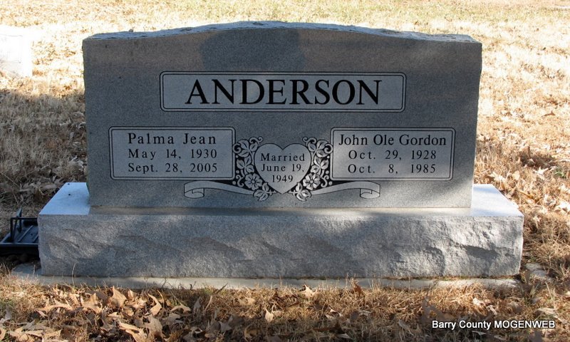 Oct. 8, 1985 | SSW: Palma Jean - Inscription: "Married June 19, 1949" - Research Note: Son of Roy Godfred Anderson and Ila Gene Bowers. John O. Gordon Anderson, age 20, married Palma Jean Munter, age 19, on June 19, 1949 in Neosho, Newton Co., MO. Ila G. Anderson, mother of John, gave consent. Brian's note - He was CPL US Marine Corps WWII. Photo of military stone at findagrave.com. | Census MO Marriage Records Phyllis Long Headstone Brian Shay Photo Jack Fly |