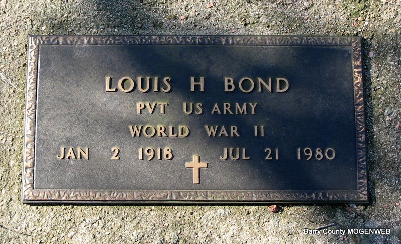 | BOND, Louis Harold | Jan. 2, 1918 | July 21, 1980 | SSW: Mary E. - Inscription: "Married Jan. 20, 1940" - Research Note: He was a son of Louis L. and Laura (Lucas) Bond. Louis H. Bond, age 22, married Mary Elizabeth Henson, age 17, on Jan. 21, 1940 in Charleston, Mississippi Co., MO. Millie Henson, mother of Mary, gave consent. - Military Stone - Inscription: "PVT US ARMY WORLD WAR II" | Brother's Obit MO Marriage Records Census Phyllis Long Headstone Penny Cooper Bailey Photos Jack Fly |