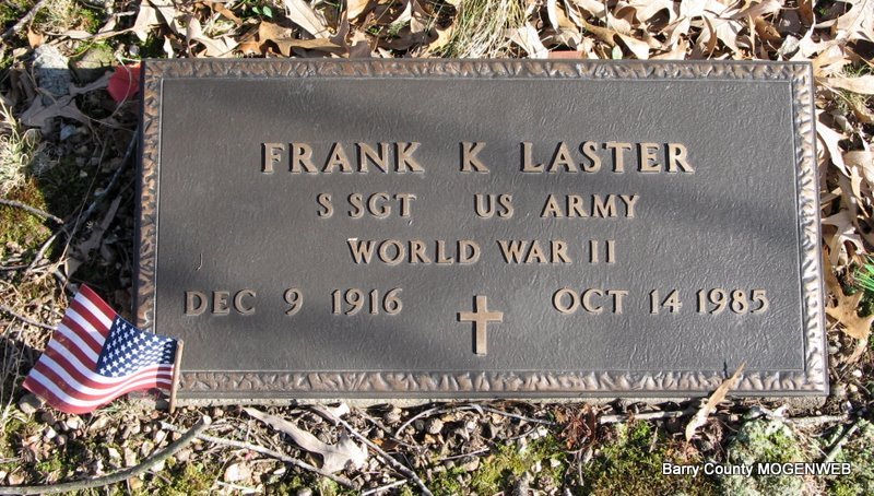Inscription: "S SGT US ARMY WORLD WAR II" - Research Note: Son of Frank Laster and Eva Leona Vandruff. A native of McLouth, Kan., he moved to Shell Knob 11 years ago. He was a World War II Army veteran and retired in 1974 after 27 years as a stillman with the Standard Oil Refinery in Sugar Creek. He was a member of Shell Knob Baptist Church. His wife was Joann Patton. The body has been cremated by Axley's Mortuary. Burial will be in Viola Cemetery at a later date. | Obit Phyllis Long Headstone Penny Cooper Bailey Photo Jack Fly |