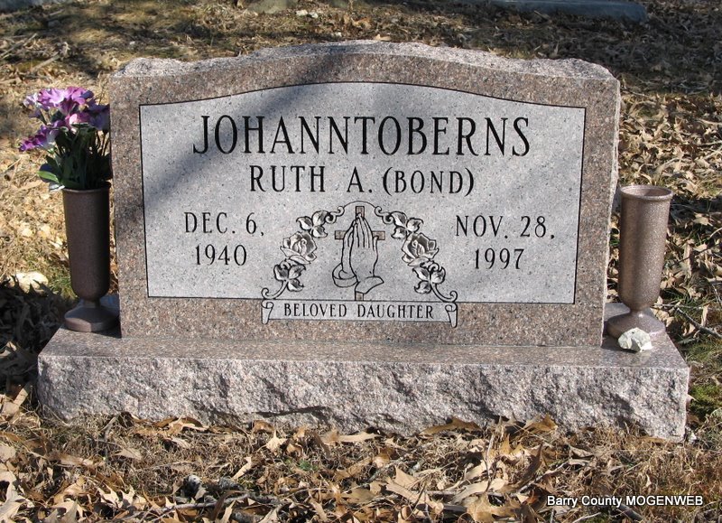 | JOHANNTOBERNS, Ruth A. (BOND) | Dec. 6, 1940 | Nov. 28, 1997 | Inscription: "Beloved Daughter" - Research Note: Daughter of Harold L. Bond and Mary E. Henson. | SS Claims Index Phyllis Long Headstone Penny Cooper Bailey Photo Jack Fly |