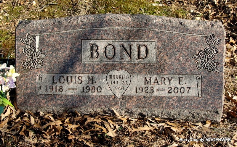 SSW: Louis H. - Inscription: "Married Jan. 20, 1940" - Research Note: Mary Elizabeth Bond, age 83, of St. Charles, formerly of Shell Knob, passed away Saturday, Feb. 17, 2007, in St. Joseph's Health Center, St. Charles. She was born June 24, 1923, in Harville, and was a daughter of James Robert and Mellia Eveline (Sloats) Henson. On Jan. 21, 1940, in Charleston, she was united in marriage to Louis Harold Bond who preceded her in death on July 21, 1980. She was also preceded in death by her parents, one daughter, a grandson, four sisters and three brothers. | Headstone Penny Cooper Bailey Photo Jack Fly Cassville Democrat Feb. 22, 2007 Donna Cooper |