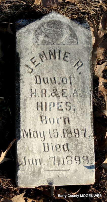| HIPES, Jennie R. | May 15, 1897 | June 7, 1898 | Inscription: "Dau. of H. R. and E. A. Hipes" | Headstone Penny Cooper Bailey Photo Jack Fly |
