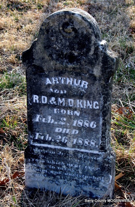 | KING, Arthur | Feb. 2, 1886 | Feb. 26, 1888 | Inscription: "Son of R. D. and M. D. King" - Research Note: Son of Rufus D. King and Mary D. Robertson. | Note Phyllis Long Headstone Penny Cooper Bailey Photo Jack Fly |