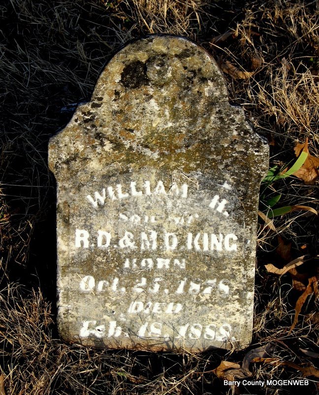| KING, William H. | Oct. 25, 1878 | Feb. 18, 1888 | Inscription: "Son of R. D. and M. D. King" - Research Note: The stone is broken but the death date is readable. Son of Rufus D. King and Mary D. Robertson. | Census Phyllis Long Headstone Penny Cooper Bailey Photo Jack Fly |