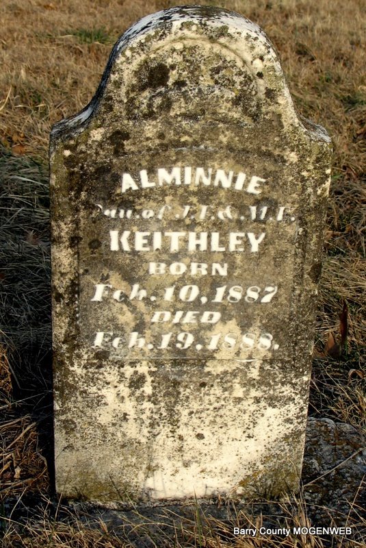 | KEITHLEY, Alminnie | Feb. 10, 1887 | Feb. 19, 1888 | Inscription: "Dau. of J. F and M. F. Keithley" | Headstone Penny Cooper Bailey Photo Jack Fly |