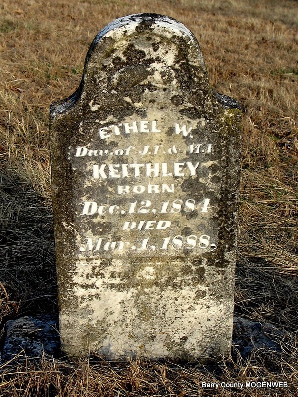 | KEITHLEY, Ethel W. | Dec. 12, 1884 | Mar. 1, 1888 | Inscription: "Dau. of J. F. and M. F. Keithley" | Headstone Penny Cooper Bailey Photo Jack Fly |