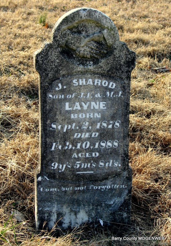 | LAYNE, J. Sharod | Sept. 2, 1878 | Feb. 10, 1888 | Inscription: "Son of J. T. and M. J. Layne - Aged 9 y's 5 m's and 8 d's." | Headstone Penny Cooper Bailey Photo Jack Fly |