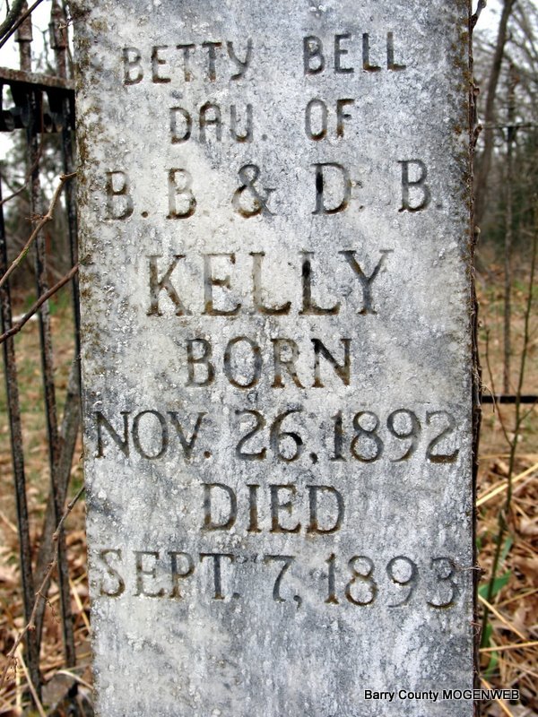 | KELLY, Betty Bell | Nov. 26, 1892 | Sept. 7, 1893 | Inscription: "Dau. of B. B. and D. B. Kelly" - Research Note: Daughter of Benjamin Baker Kelly and Dora Belle Hood, both buried at Purdy Cemetery. - Another Photo - Enclosure for Kelly Graves | Note Phyllis Long Headstone Penny Cooper Bailey Photos Jack Fly |