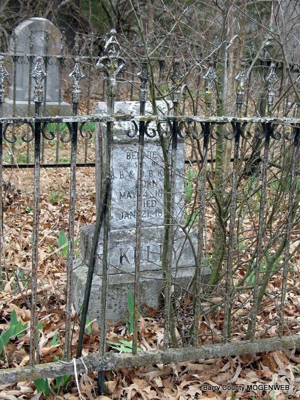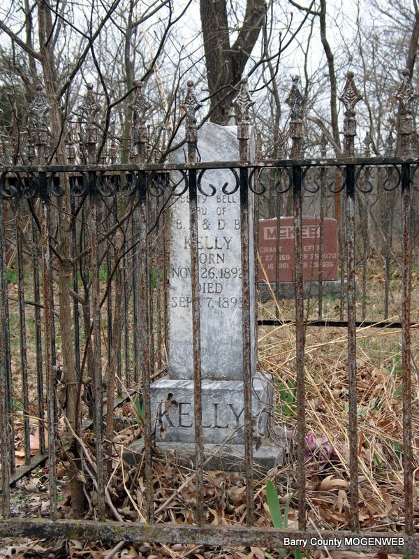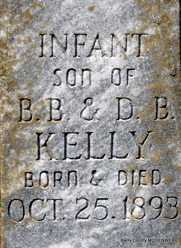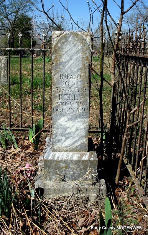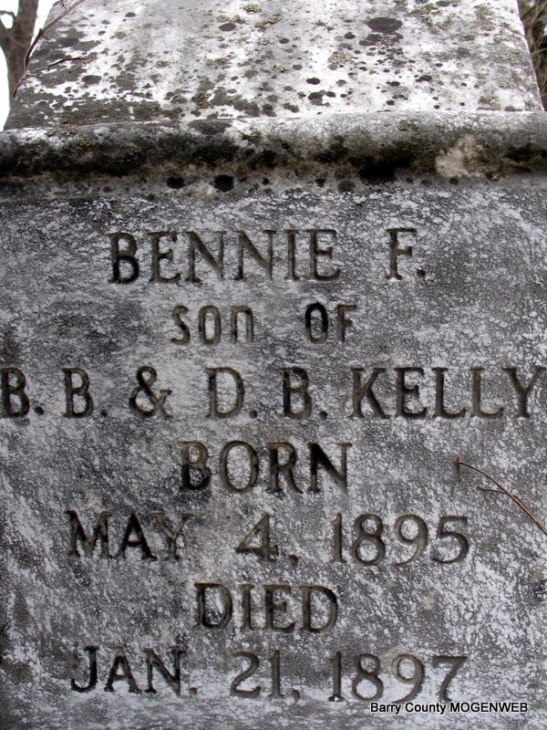 | KELLY, Bennie F. | May 4, 1895 | Jan. 21, 1897 | Inscription: "Son of B. B. and D. B. Kelly" - Research Note: Son of Benjamin Baker Kelly and Dora Belle Hood, both buried at Purdy Cemetery. - Cassville Republican, Jan 28, 1897 - Ben H. Kelly, Jr. born May 4th, 1895, died Jan. 21, 1897, at Viola, Mo., of pneumonia. The deceased was the only son of Dr. B. B. Kelly and wife. Little Benny was taken dangerous from the start through hope was not abandoned to the last. The remains were laid to rest in the Viola burying grounds, Jan. 23rd, witnessed by many sad hearts and tear stained eyes. The bereaved parents and relatives have the sympathy of the entire community, the host of whom have felt the severe sting of death and have witnessed the flight of many souls to the parents no less dear oh the other shore. - Another Photo - Enclosure for Kelly Graves | Online Obit Phyllis Long Headstone Penny Cooper Bailey Photos Jack Fly |