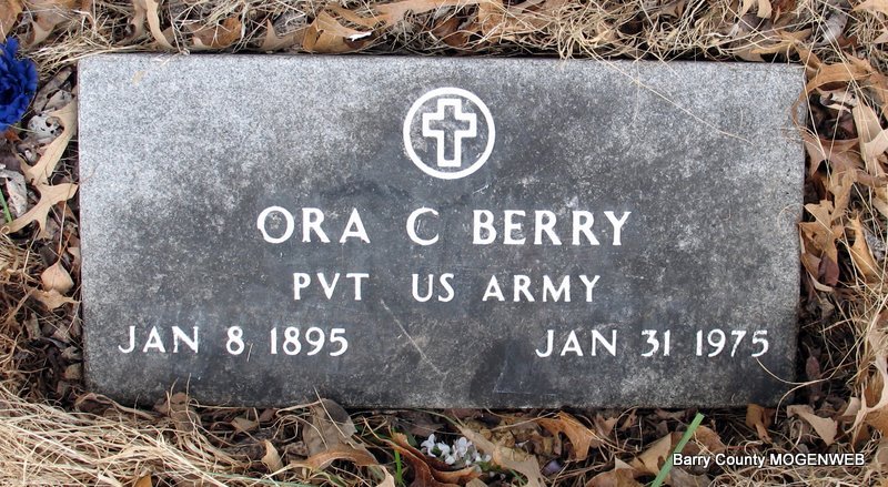 | BERRY, Ora Canar | Jan. 8, 1895 | Jan. 31, 1975 | Inscription: "PVT US ARMY" - Research Note: Son of John Canar Berry and Matilda Susan Holloway. Ora C. Berry, age 23, married Litha Ellen Wise, age 23, on Dec. 5, 1918 in Carroll Co. AR. Litha died in 1955 and is buried at High Cemetery, Berryville, Carroll Co., AR. | Census AR Marriage Index Phyllis Long Headstone Penny Cooper Bailey Photo Jack Fly |