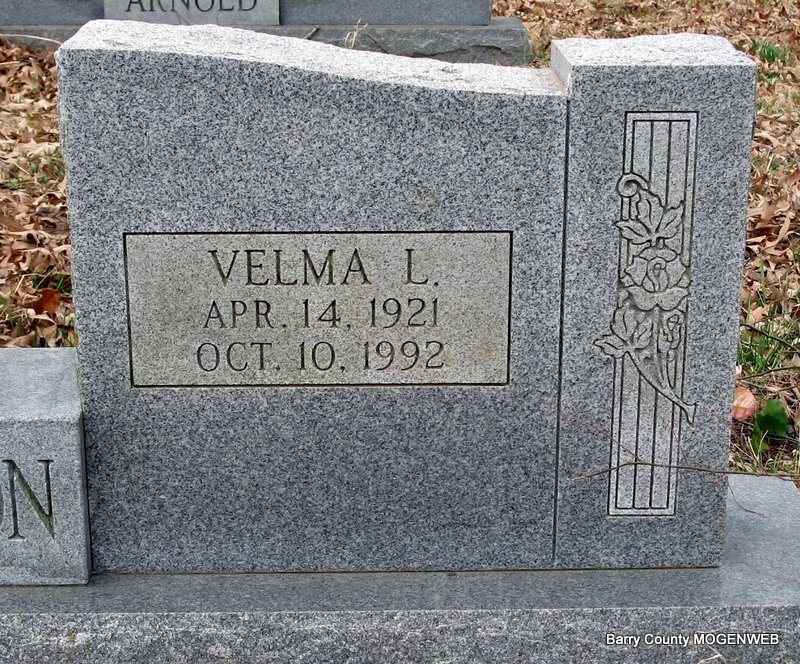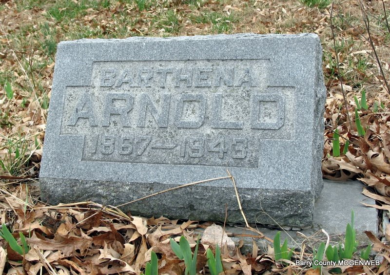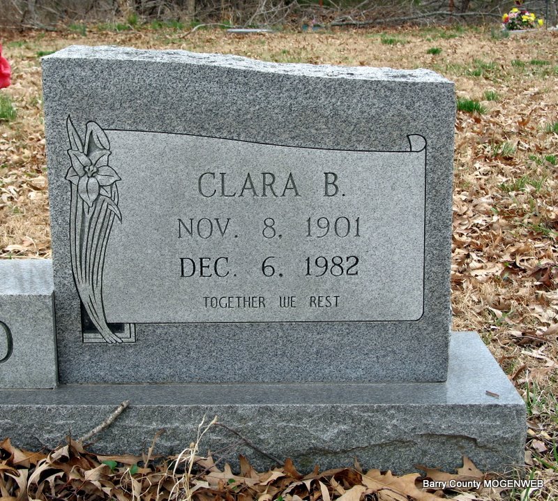 | ARNOLD, Clara Bessie (JONES) | Nov. 8, 1901 | Dec. 6, 1982 | SSW: Clarence - Inscription: "Together We Rest" - Research Note: Daughter of James Elbert Jones buried Columbus, Cherokee Co., KS and Minnie Maxwell buried at Mineral Springs Cemetery. - Cassville Republican, Dec. 18, 1919 - Licenses to Wed: Clarence Arnold, 18, Viola and Clara Jones. - Another Photo | Census Online Newspapers Phyllis Long Headstone Penny Cooper Bailey Photo Jack Fly |