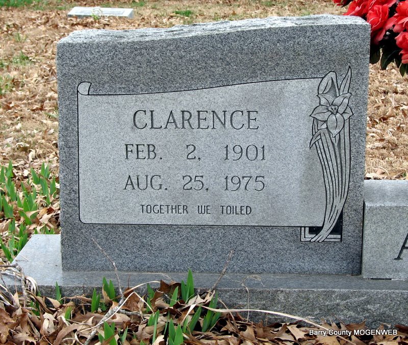 | ARNOLD, Clarence | Feb. 2, 1901 | Aug. 25, 1925 | SSW: Clara B. - Inscription: "Together We Toiled" - Research Note: Son of Robert Madison Arnold and Barthena Burton. - Another Photo | Census Phyllis Long Headstone Penny Cooper Bailey Photo Jack Fly |