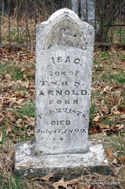 | ARNOLD, Isac | Feb. 22, 1878 | July 17, 1899 | Inscription: "Isac - Son of T. S. and S. Arnold" - Research Note: Son of Thomas Arnold and Shrilda Nichols. | Census Phyllis Long Headstone Penny Cooper Bailey Photo Jack Fly |