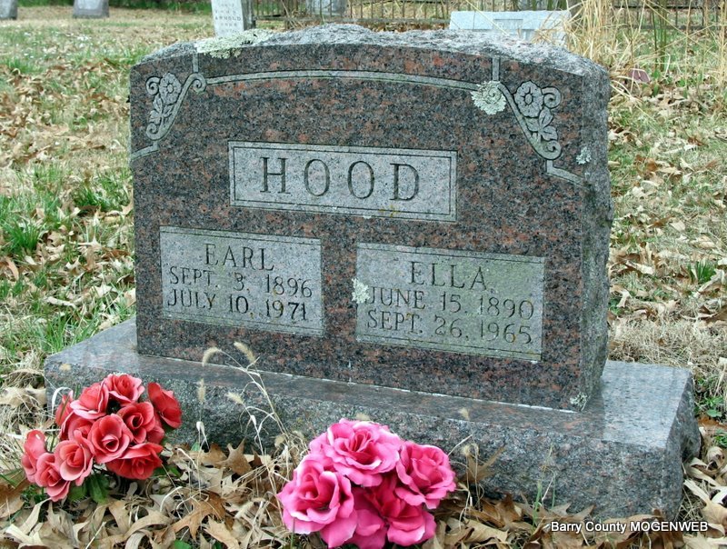 | HOOD, Ella (VON MARENHOLTZ) | June 15, 1890 | Sept. 26, 1965 | SSW: Floyd Earl - Research Note: Daughter of Carl Von Marenholtz and Caroline "Lena" S. Spoetter, both buried at Viola Cemetery. Ella Von Marenholtz married Earl Hood on June 13, 1915 in Barry Co., MO. | Census MO Marriage Records Phyllis Long Headstone Penny Cooper Bailey Photo Jack Fly |