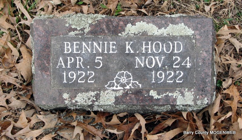 | HOOD, Bennie K. | Apr. 5, 1922 | Nov. 24, 1922 | No Data | Headstone Penny Cooper Bailey Photo Jack Fly |