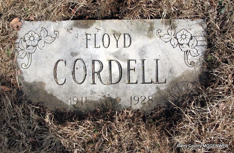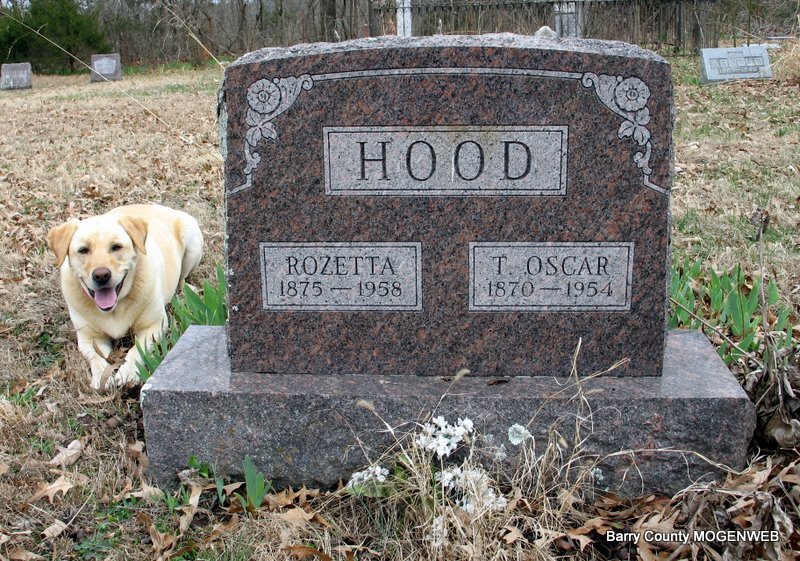 SSW: Ella- Research Note: Floyd Earl Hood was born in Viola and was age 74 years old when he died. He had lived in the Cassville community for 35 years. His wife was Ella Von Marenholtz, deceased. His father was Oscar Hood and mother Rosetta "Zetta" Gunnels. His daughter was Mrs. Beulah Cox, of Exeter, MO, and she was his closet relative and the informant on the death certificate. Resident of rural Cassville, Barry Co., MO. His son Johnny Richard Hood is buried in Corinth Cemetery, died in 1968. | Headstone Penny Cooper Bailey Photo Jack Fly Culver Funeral Home Vol. 14, P. 89 Donna Cooper Death Certificate Phyllis Long |