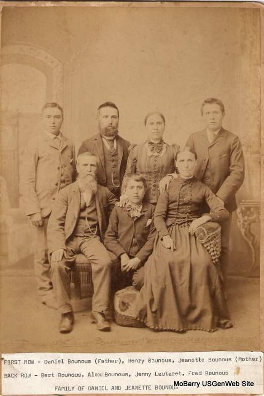 First Row: Daniel Bounous (Father), Henry Bounous, Jeanette Bounous (Mother) Back Row: Bert Bounous, Alex Bounous, Jenny Lauteret, Fred Bounous 1940 Census, Monett Township, Barry, Barry, Missouri Daniel Bounous in household of Victorene Bounous Head Victorene Bounous F 57 Italy Son Daniel Bounous M 28 Missouri Son Calvin Bounous M 26 Missouri Daughter Freda Bounous F 22 Missouri Son Eugene Bounous M 18 Missouri Submitted in 2007 by Mike Bounous |